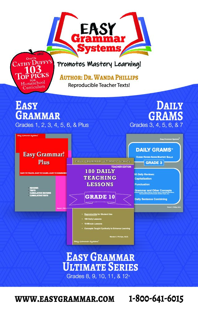 Easy Grammar – Easy Grammar Systems is a leading publisher for grammar and writing curriculum for grades 1 – 12+. Author Dr. Wanda Phillips has made learning grammar easy and enjoyable while ensuring that students achieve mastery. Concepts are presented with the most basic skill first, and skills build for ease in understanding. Parents and teachers love the ideas and strategies that promote mastery. It truly is “Easy to Teach . . . Easy to Learn . . .  Easy to Remember!”