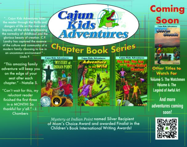 Cajun Kids Adventures – CAJUN KIDS ADVENTURES is a children’s chapter book series for ages 8 and up. The series follows the experiences of five children who, along with their parents, moved to Willow Hammock, a remote region of South Louisiana near the mouth of the Atchafalaya River. Beth, Mark, Timmy, Annie and Sam spend their days searching for adventure in the swamps and marshes surrounding them. But the five siblings now calling Willow Hammock home are realizing that searching for it proved unnecessary. They have learned that adventure, danger, mystery and laughter will always find them.