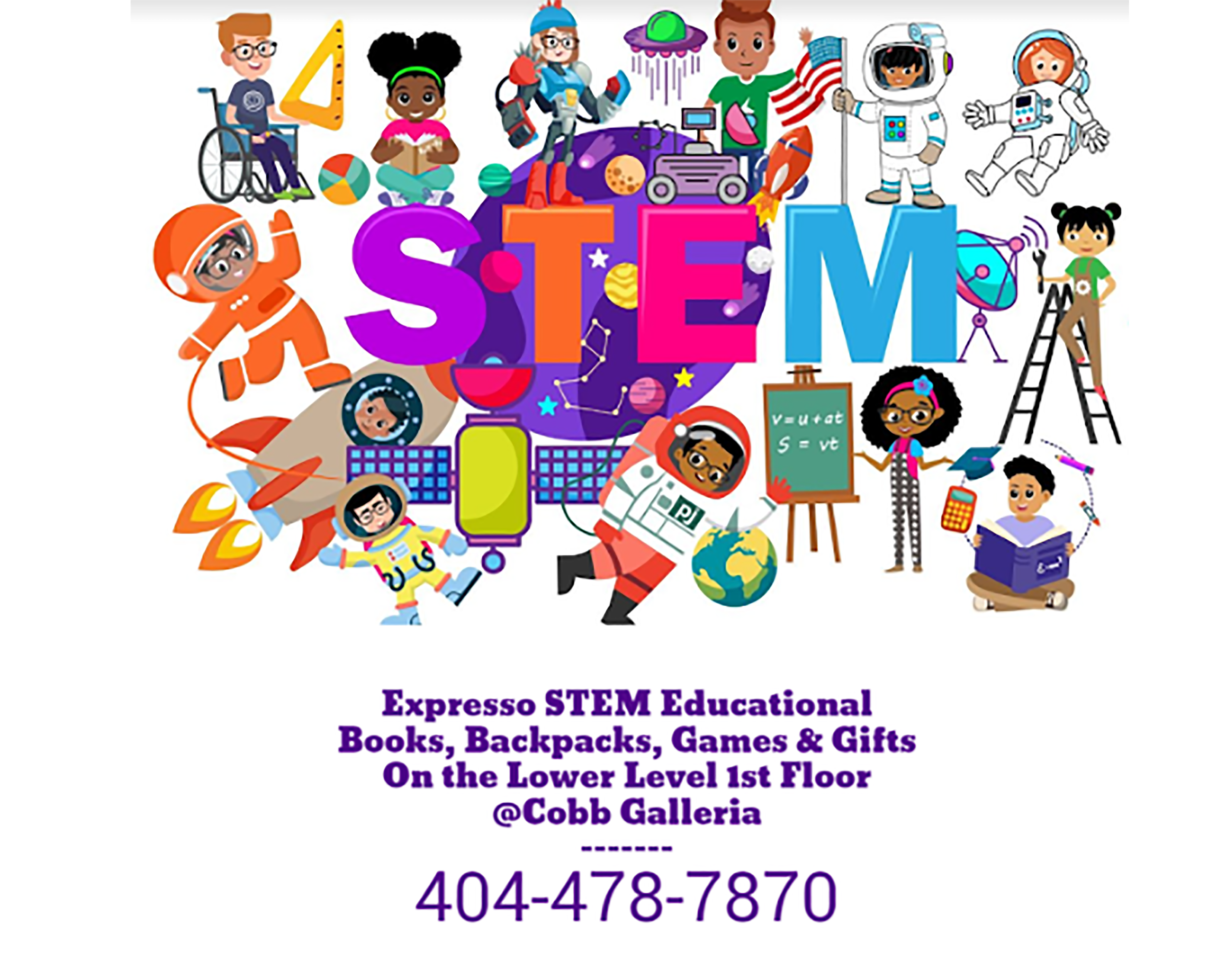 Expresso STEM Educational – Books, Backpacks, Games & Gifts on the lower level 1st floor @ Cobb Galleria.  (404)478-7870