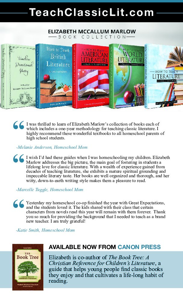 Teach Classic Lit – Elizabeth McCallum Marlow, M.A., taught high school and College English for thirty-five years. She developed approaches that she found were effective in teaching teenagers to enjoy literature. Her four high school literature guides provide teachers with an experienced teacher’s methodology. Elizabeth is co-author of The Book Tree: A Christian Reference for Children’s Literature, a reference guide that helps young people find books they enjoy and that cultivates a life-long habit of reading.