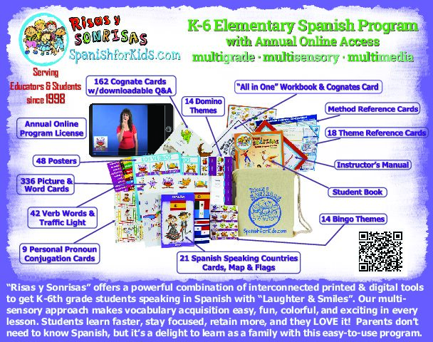 Spanish For Kids – Risas y Sonrisas Spanish for Kids is a comprehensive, flexible, fun, and easy-to-use multi-grade curriculum for teaching Spanish to elementary school children (K-5th grade). They follow Communicative Language Teaching practices, focusing on the interaction between students and instructors. All physical and digital materials interconnect for a multi-modal approach to learning that appeals to all ages and learning styles. The curriculum integrates speaking, listening, reading, and writing skills in developmentally appropriate ways that can be adapted for learners aged 4 to 11.