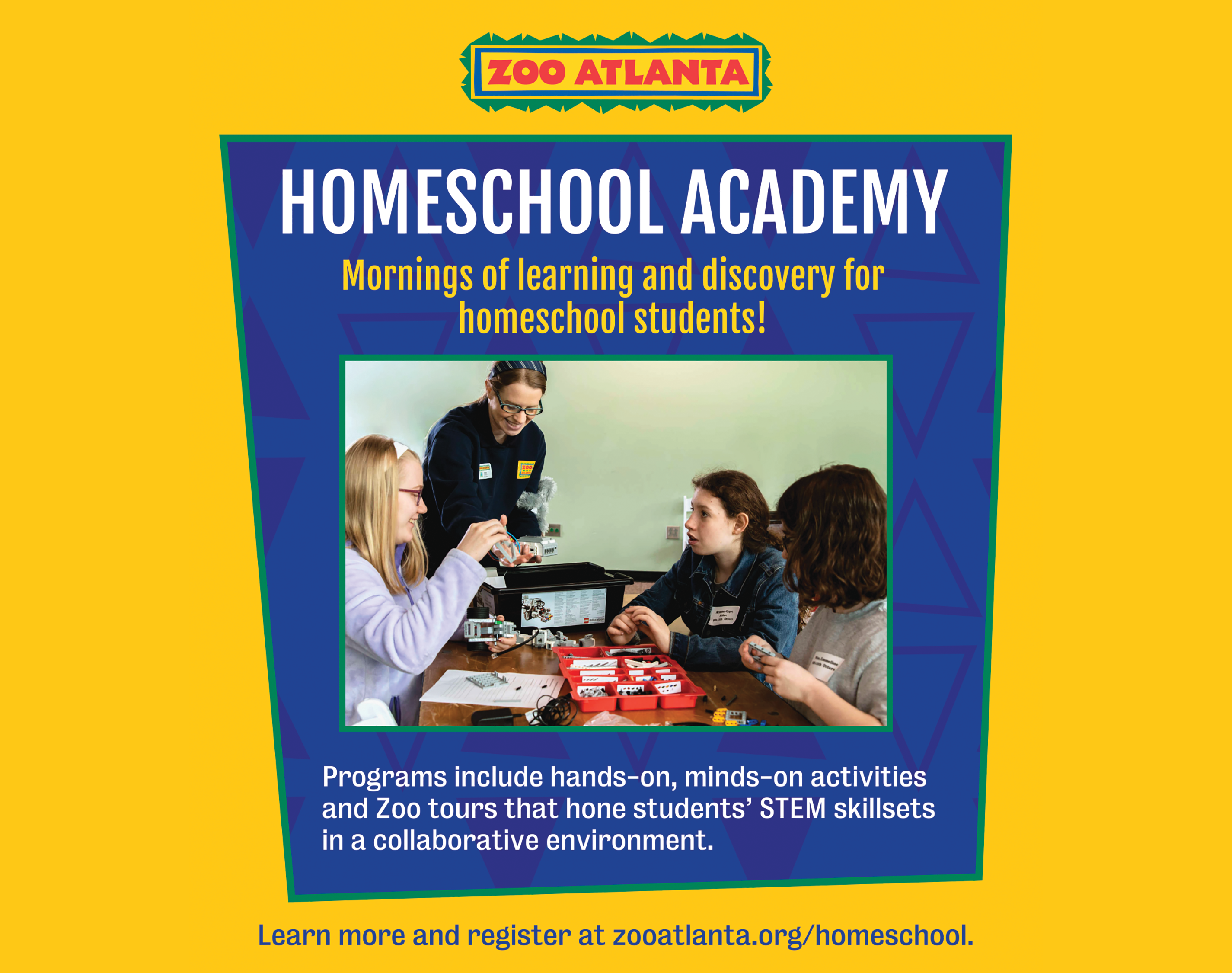 Zoo Atlanta Homeschool Academy – HomeSchool Academy is a two-hour program that allows students to explore animal and science concepts in an engaging, interactive environment. Programs are grade-appropriate and include hands-on, minds-on activities and Zoo tours that hone students’ STEM skillsets in a collaborative environment.