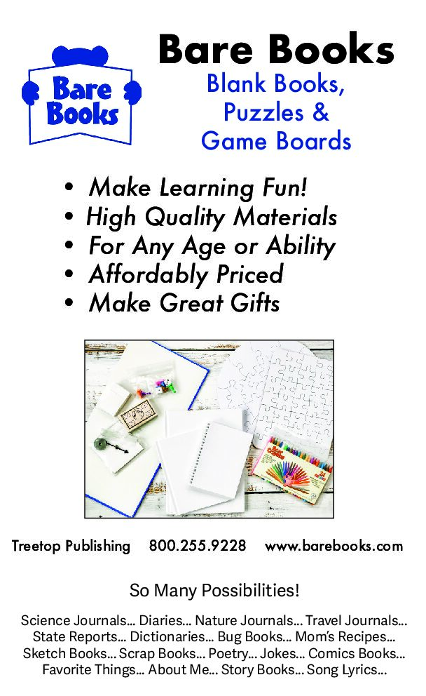 Bare Books – Bare Books and other “Bare” educational products are unique and some of the most inspiring you’ll find. Bare Books give students a creative canvas for their writing, and become a cherished keepsake for parents! Bare Game Boards, Bare Puzzles, Bare Calendars, and the rest, offer a fun twist on learning and provide the resources for a truly memorable project.